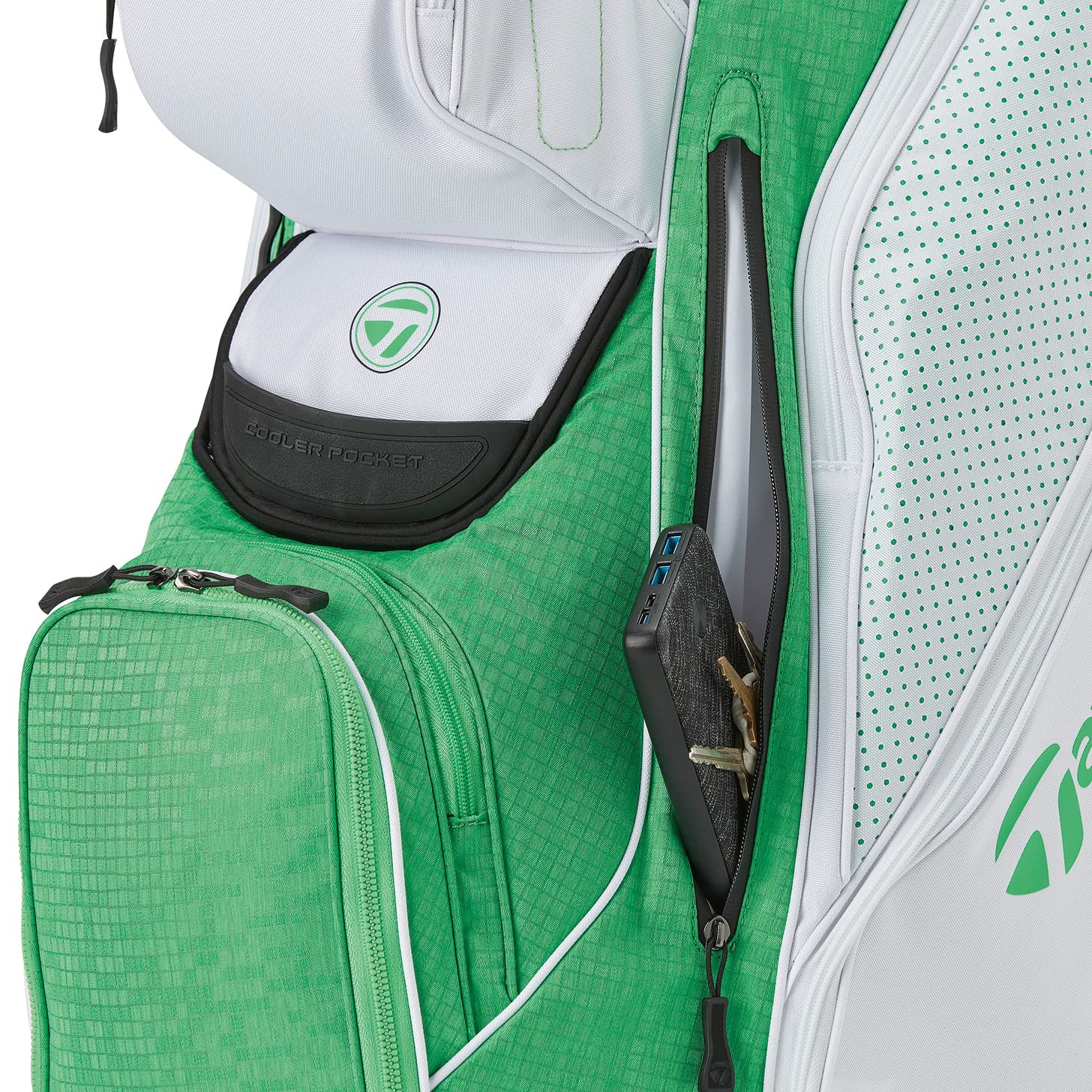 TaylorMade's ultimate riding bag is engineered for maximum access, organizational ease and max storage – delivering everything the golfer needs and more in a premium package. Seven strategically placed front-facing pockets ensure easy storage and access throughout the round. A magnetic clasp on that dual closure accessories pocket lets you quickly get to frequently used items like tees, golf balls and ball markers. A large cooler pocket with a built-in drainage system allows golfers to store food and beverages for the length of the round.